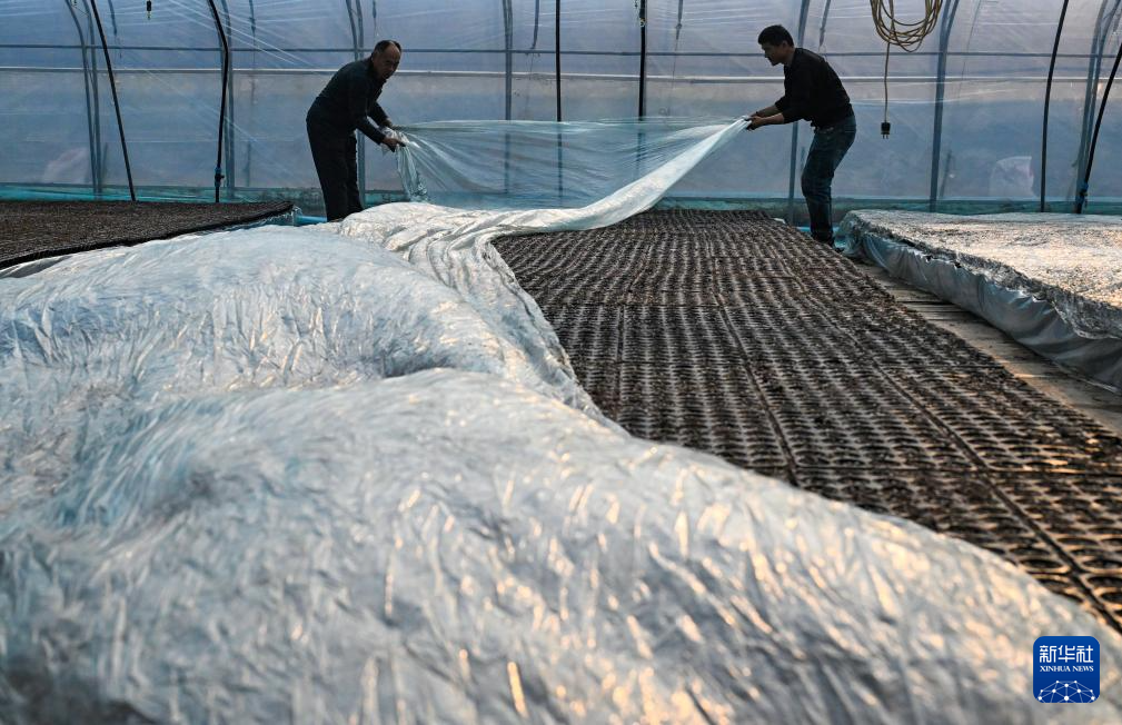 12月11日,在河南省商丘市夏邑县会亭镇朱瓦房村大棚育苗基地,村民为刚刚下种的育苗苗床覆盖薄膜保温。新华社发(王高超摄)