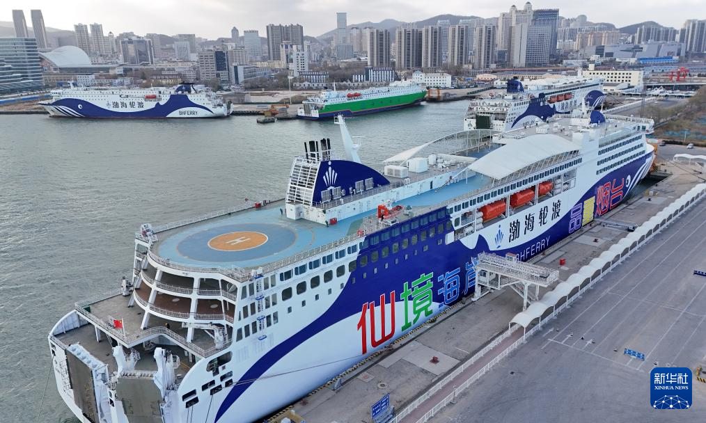 12月11日,客轮在山东港口烟台港停靠避风(无人机照片)。新华社发(唐克摄)