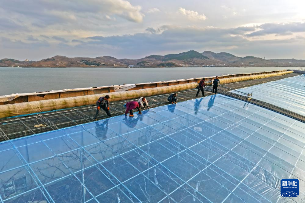 12月11日,在山东省烟台市福山区张格庄镇,农民为樱桃大棚更换新的塑料薄膜(无人机照片)。新华社发(孙文潭摄)
