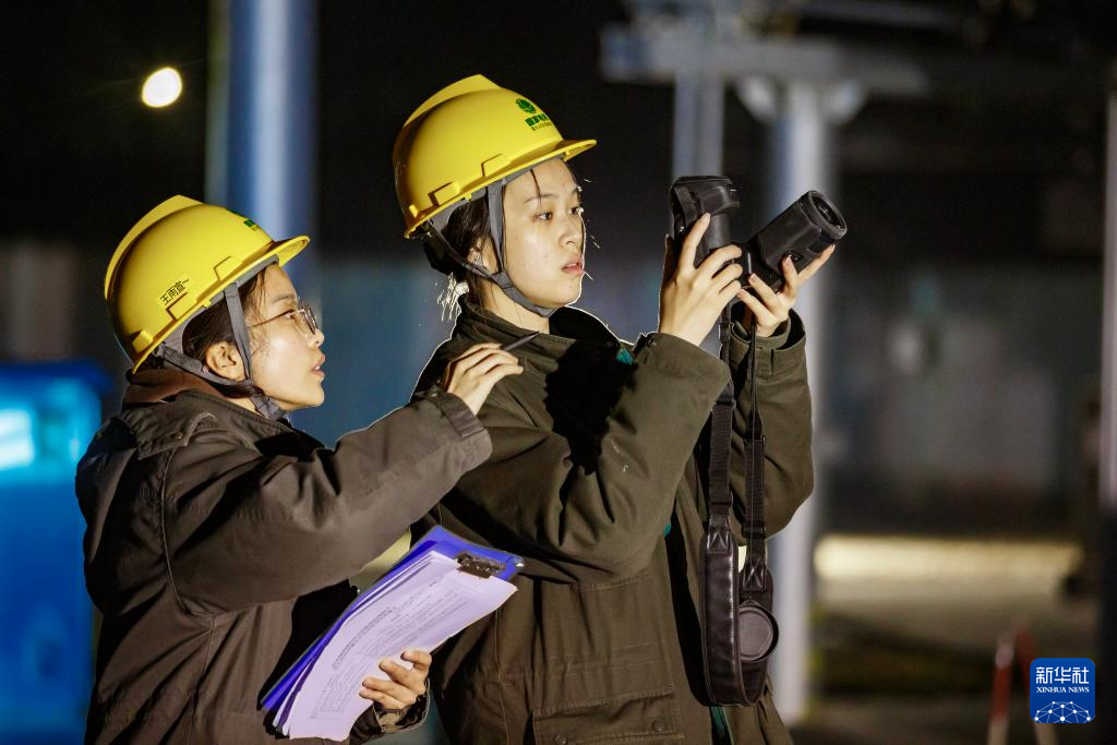 12月10日,在河南省商丘市睢县110千伏董店变电站内,国网河南省电力公司睢县供电公司工作人员在对设备开展夜巡。新华社发(徐泽源摄)