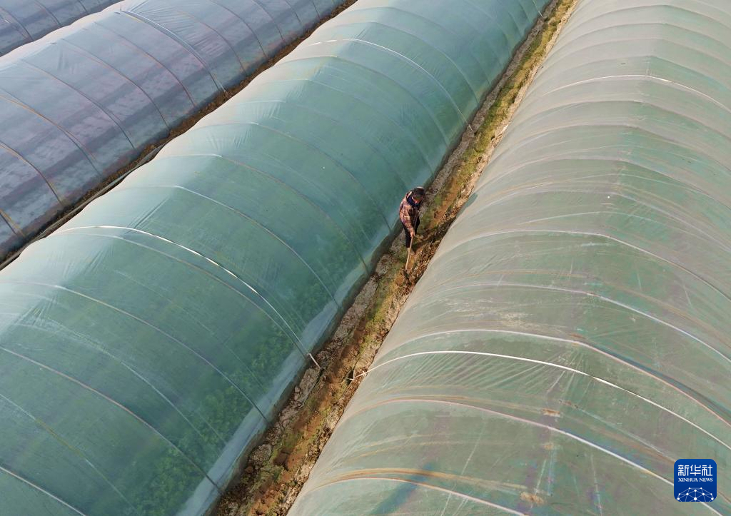 12月10日,河南省南阳市新野县城郊乡吕庄村,村民在蔬菜种植基地对蔬菜大棚进行封土加固(无人机照片)。新华社发(高嵩摄)