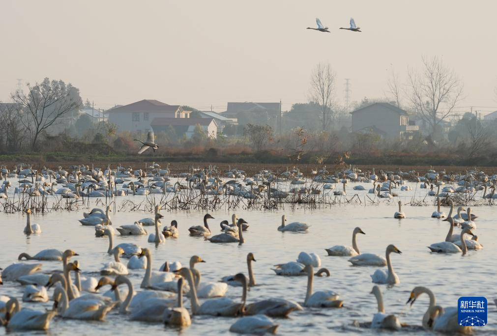 12月15日在湖南省岳阳市汨罗市屈原管理区东古湖湿地拍摄的小天鹅。新华社发(曹正平摄)