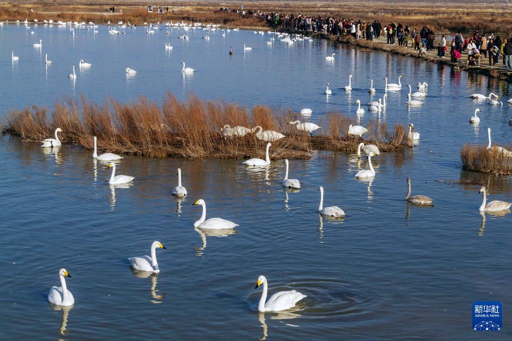 12月14日,游客在山西省运城市盐湖湿地观赏越冬天鹅。新华社发(姜桦摄)