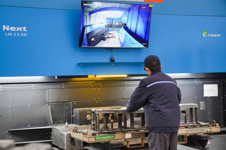 在山东睿航科技有限公司车间里,三维激光切割工序员工在进行切割前的上件准备。王建炜 摄