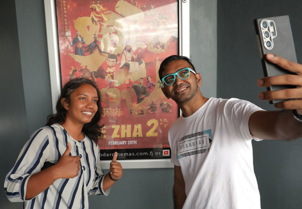 ↑2025年2月20日,在斐济首都苏瓦,观众在《哪吒之魔童闹海》电影海报前自拍。斐济首都苏瓦市达莫达尔影院市场部经理克利夫表示,在2月20日电影上映的首日,苏瓦的两家影院原本共安排放映两场,但因网上预售火爆,影院临时安排加映3场,此后每天均安排4至5场。