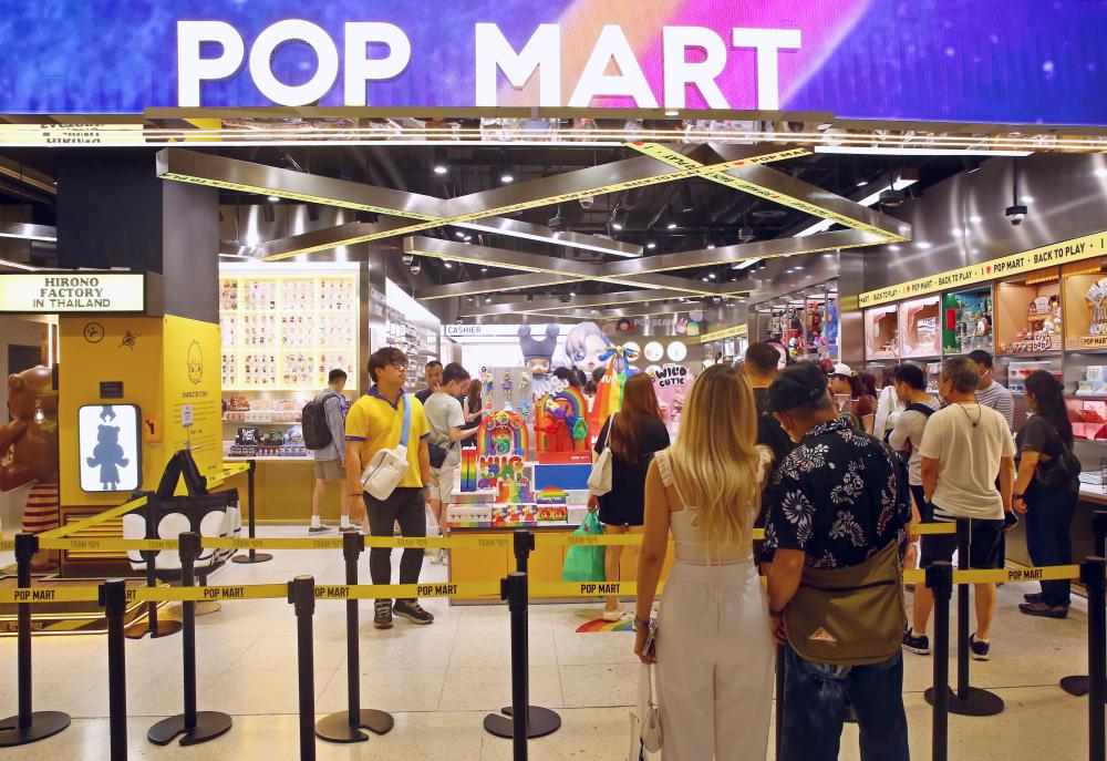 ↑2025年5月19日,在泰国曼谷尚泰世界购物中心,人们聚集在泡泡玛特门店。泡泡玛特推出的潮玩深受海外玩家喜爱。这些可爱玩偶的设计指向人们的“精神消费”和“情绪消费”需求,加之它们带来的富有趣味性的体验,使其迅速成为消费者追捧的对象。