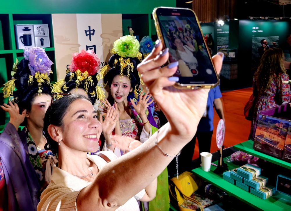↑2025年4月30日,一名参观者与唐代仕女妆造的中方参展人员在法国巴黎博览会上合影。以“中国风·中国潮”为主题的“遇鉴中国”2025中华文化主题展4月30日亮相当天开幕的法国巴黎博览会。
