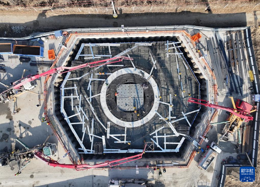 这是石雄铁路跨朔黄铁路特大桥176号墩转体桥承台浇筑现场(12月23日摄,无人机照片)。新华社记者 牟宇 摄