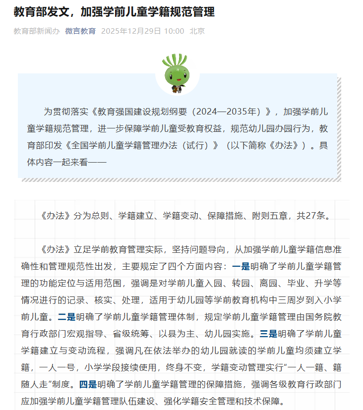 为贯彻落实《教育强国建设规划纲要(2024—2035年)》,加强学前儿童学籍规范管理,进一步保障学前儿童受教育权益,规范幼儿园办园行为,教育部印发《全国学前儿童学籍管理办法(试行)》(以下简称《办法》)。具体内容一起来看——