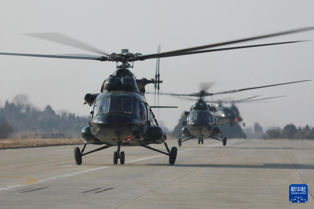 1月6日,武警第二机动总队某支队直升机编队起飞。新华社发(兰志豪 摄)