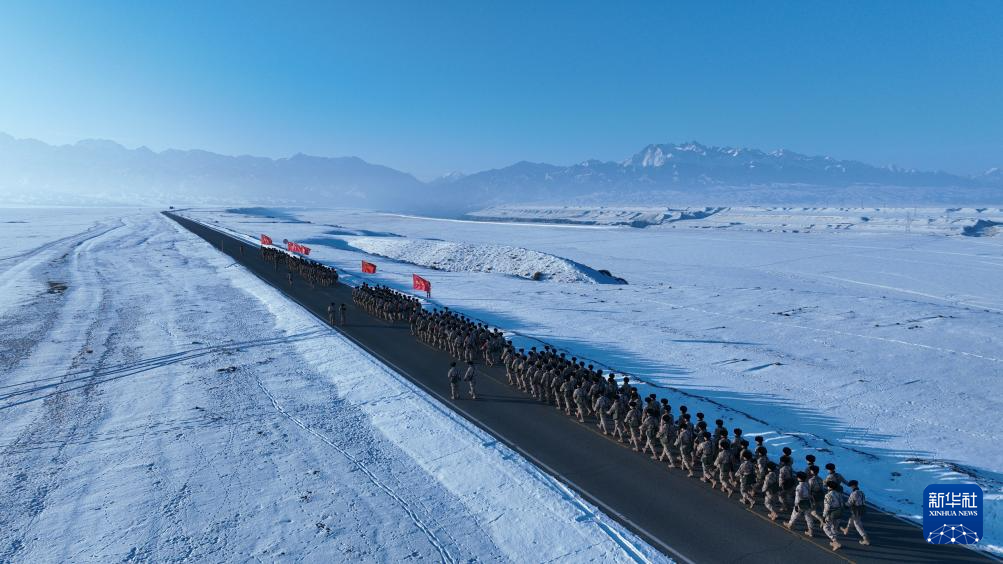 1月4日,武警兵团总队某部官兵在天山脚下组织徒步行军(无人机照片)。新华社发(周昌钰 摄)