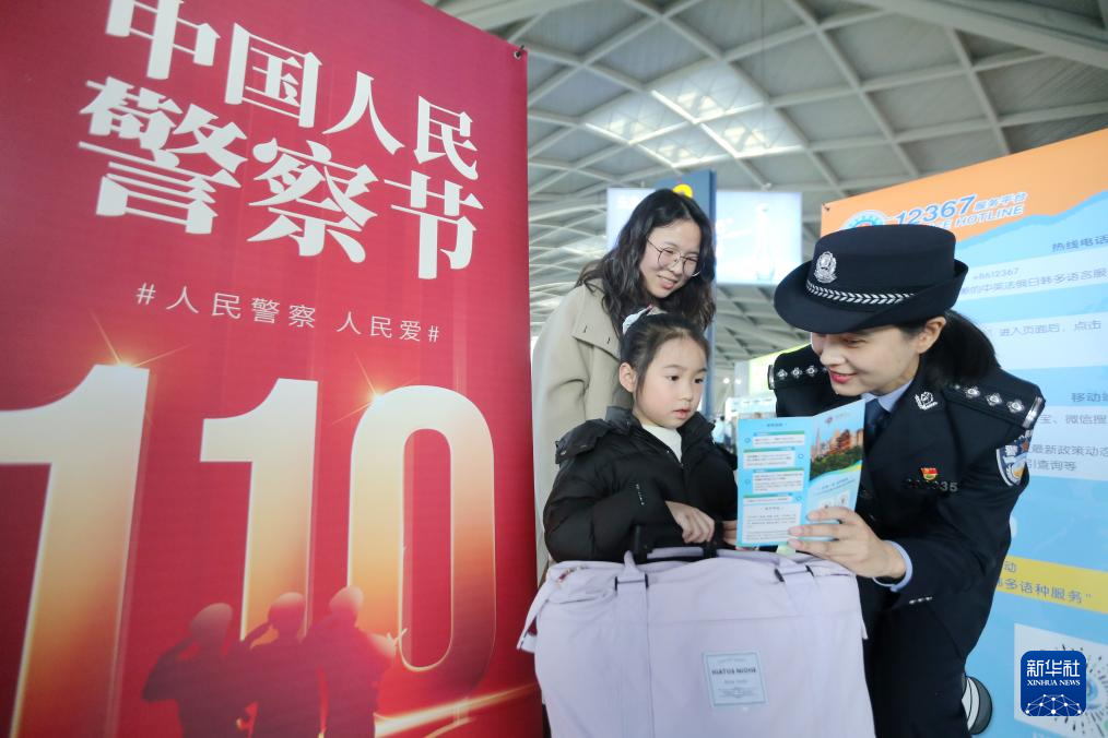 1月9日,江苏扬州出入境边防检查站民警为旅客讲解出入境法律法规知识。新华社发(孟德龙摄)
