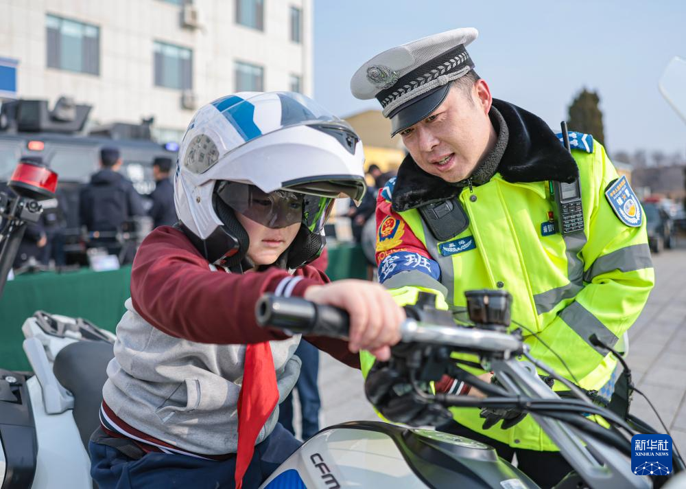 1月9日,在河南省商丘市睢县警民互动活动现场,睢县公安局交警大队民警为市民讲解道路交通安全的法律法规。新华社发(徐泽源摄)