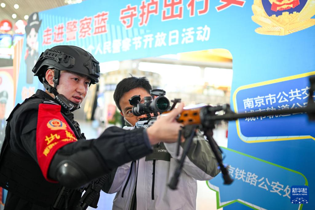1月9日,在南京南站候车大厅,旅客在南京铁路公安处民警指导下体验警用武器。新华社发(方东旭摄)