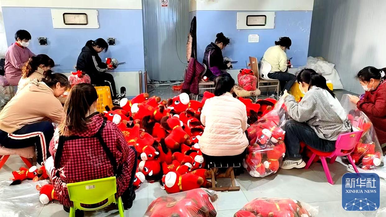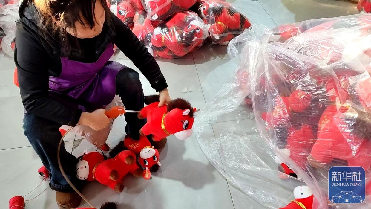 ↑ 1月12日,在位于山东的生产车间,工人忙着生产“哭哭马”小马公仔玩具。新华社发