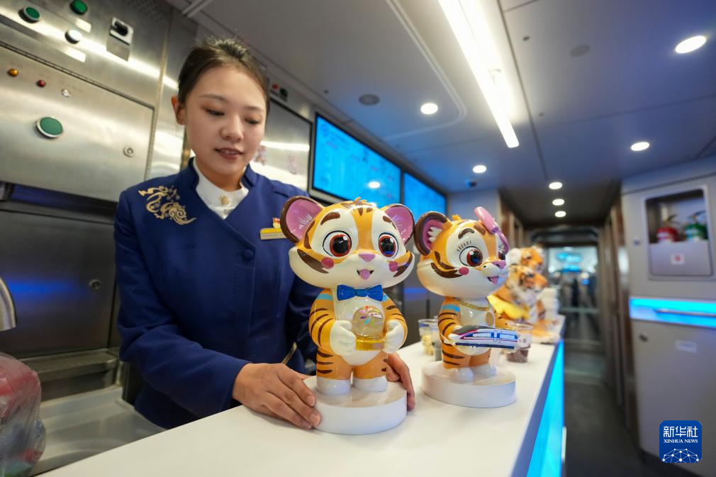 1月22日,乘务员在G902次动车组列车车厢中展示东北虎摆件。