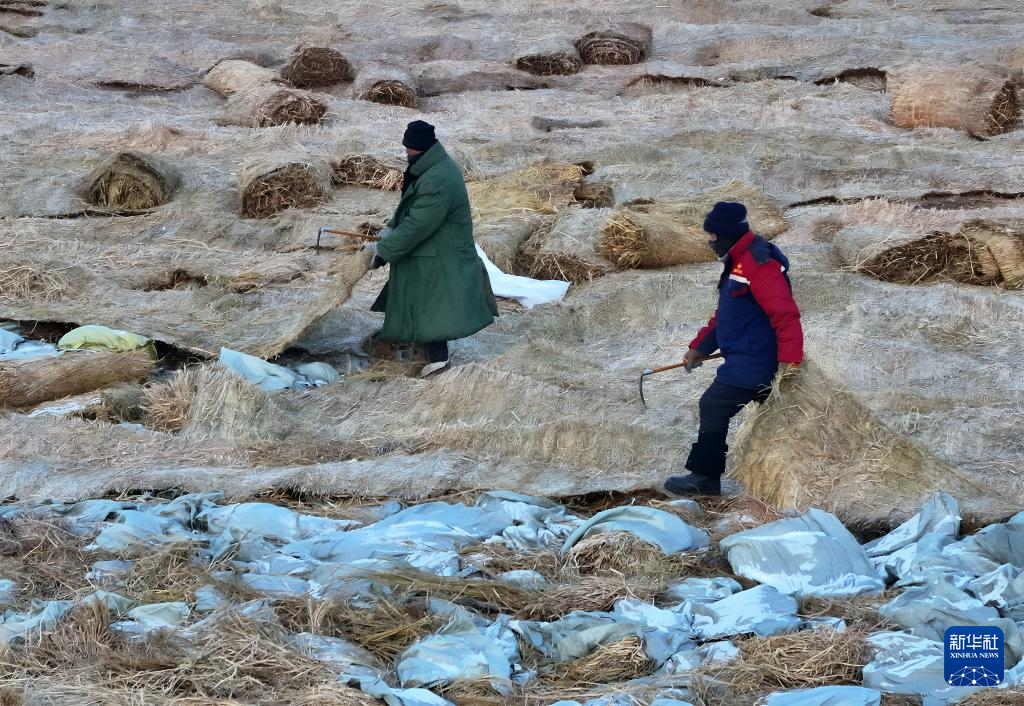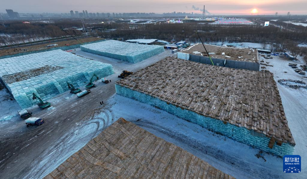 1月22日,工人在哈尔滨冰雪大世界储冰场上为冰块盖上遮盖物(无人机照片)。新华社发(张树摄)