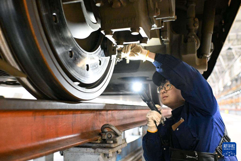 1月29日,昆明车辆段昆明西客车技术整备所内,工作人员在进行春运整备作业。新华社发(杨紫轩 摄)