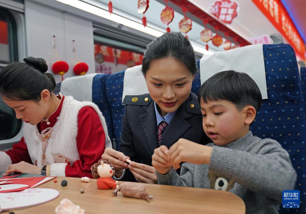 2月10日,列车工作人员陪小旅客捏橡皮泥。新华社记者 万象 摄