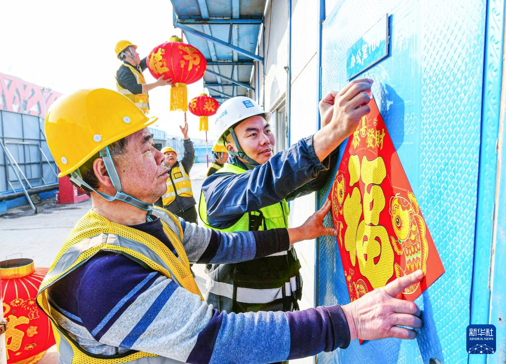 2月13日,在山东省胶州市上合示范区宋城演艺建设项目工地,中建八局四公司的工人们在生活区贴福字。新华社发(王昭脉摄)