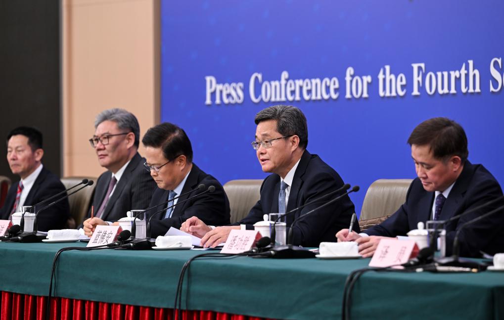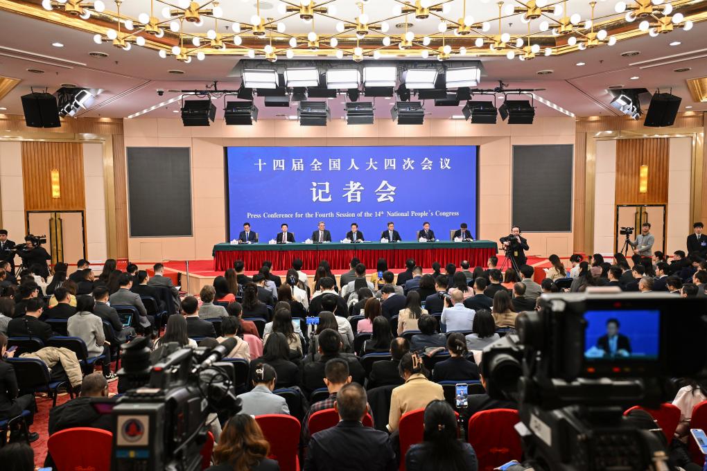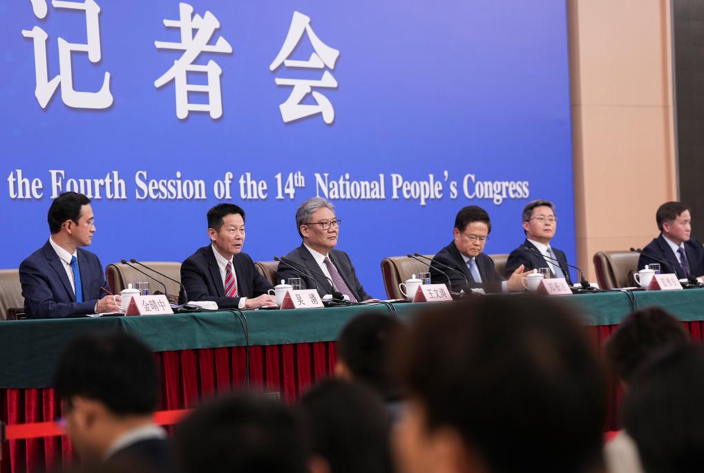 3月6日,十四届全国人大四次会议在北京梅地亚中心新闻发布厅举行记者会。国家发展和改革委员会主任郑栅洁、财政部部长蓝佛安、商务部部长王文涛、中国人民银行行长潘功胜、中国证券监督管理委员会主席吴清就发展改革、财政预算、商务、金融证券等相关问题回答中外记者提问。新华社记者 李鑫 摄