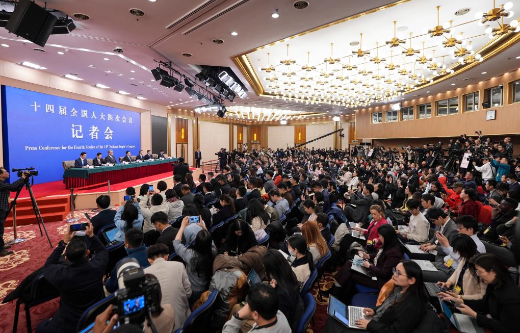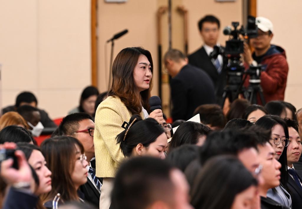 3月6日,十四届全国人大四次会议在北京梅地亚中心新闻发布厅举行记者会。国家发展和改革委员会主任郑栅洁、财政部部长蓝佛安、商务部部长王文涛、中国人民银行行长潘功胜、中国证券监督管理委员会主席吴清就发展改革、财政预算、商务、金融证券等相关问题回答中外记者提问。这是记者在提问。新华社记者 曹祎铭 摄