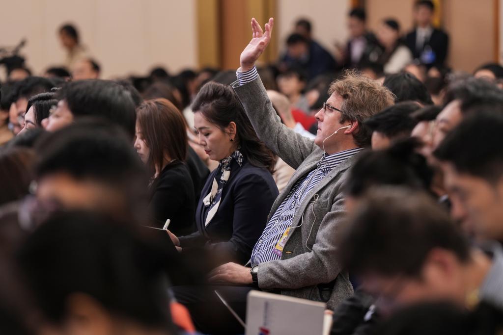 3月6日,十四届全国人大四次会议在北京梅地亚中心新闻发布厅举行记者会。国家发展和改革委员会主任郑栅洁、财政部部长蓝佛安、商务部部长王文涛、中国人民银行行长潘功胜、中国证券监督管理委员会主席吴清就发展改革、财政预算、商务、金融证券等相关问题回答中外记者提问。这是记者举手提问。新华社记者 王曦 摄