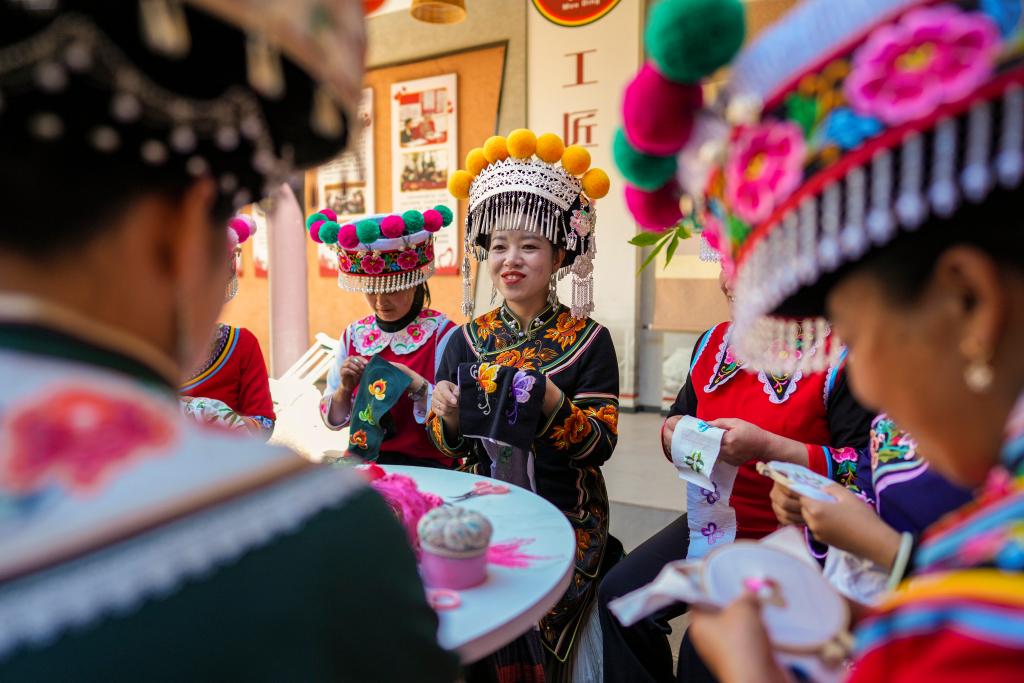 2月9日,在云南楚雄彝族自治州牟定县,全国人大代表金瑞瑞在自己的工作室内和绣娘们刺绣、谈心。新华社记者 陈欣波 摄