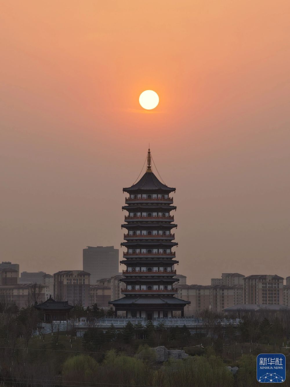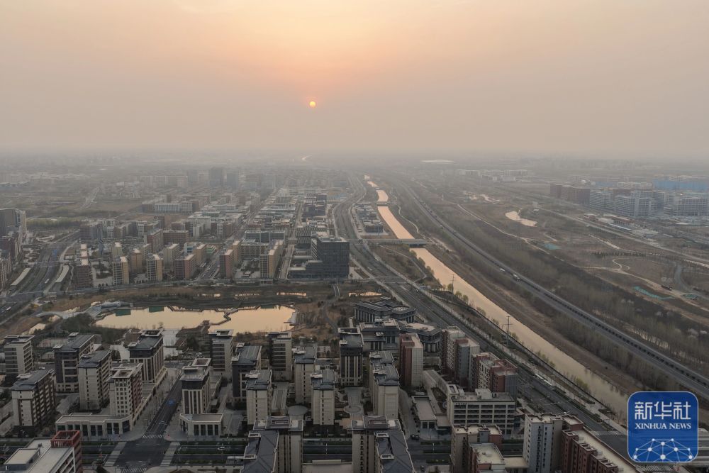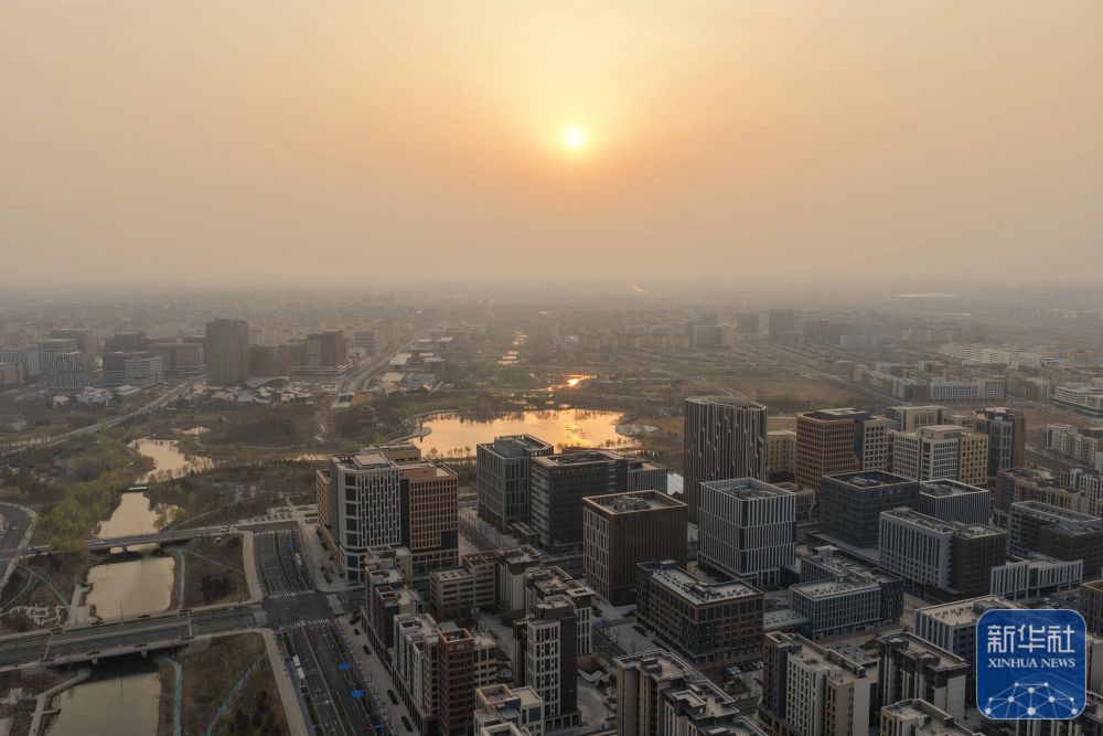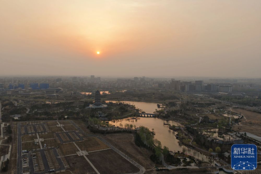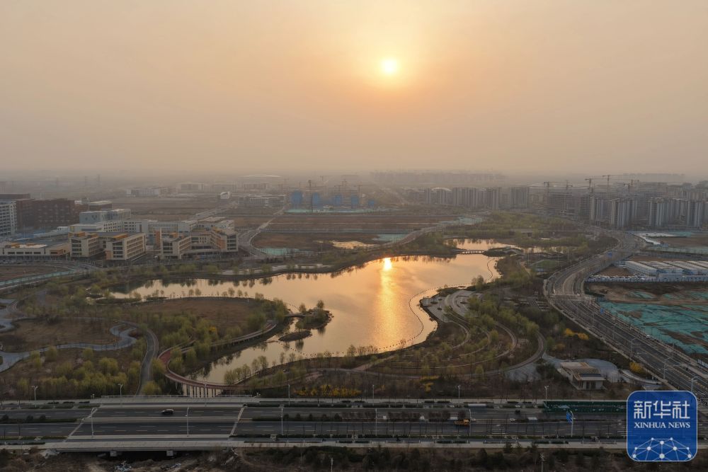 ↑ 这是3月27日在雄安新区拍摄的日出(无人机照片)。新华社记者 邢广利 摄影报道