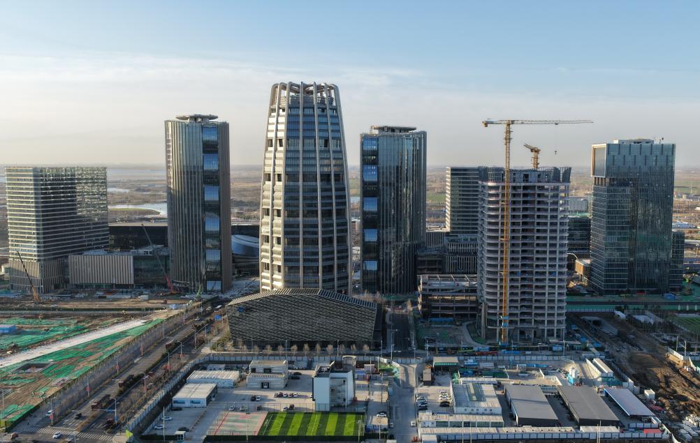 站在雄安启动区国贸中心楼顶环顾,城市核心地段的繁华景象清晰可见:3家央企总部已投入使用,5家央企总部项目建设有序推进;金融岛上,财富大厦双塔楼正装饰装修;中央绿谷铺展“水城共融”生态画卷……