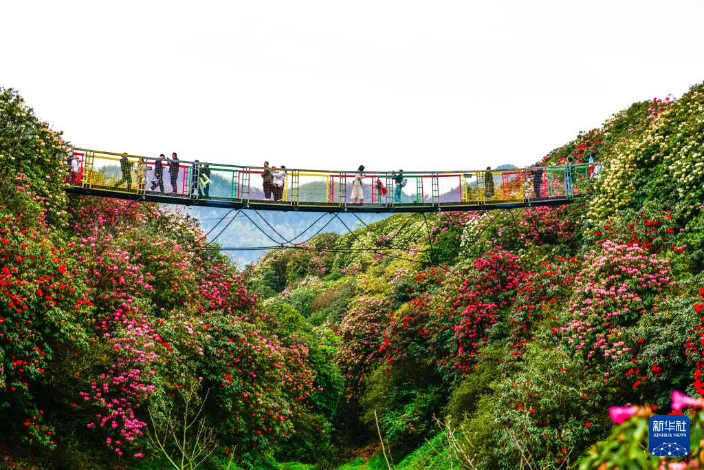 4月1日,游客在百里杜鹃管理区金坡景区一处吊桥上赏花。新华社记者 杨文斌 摄
