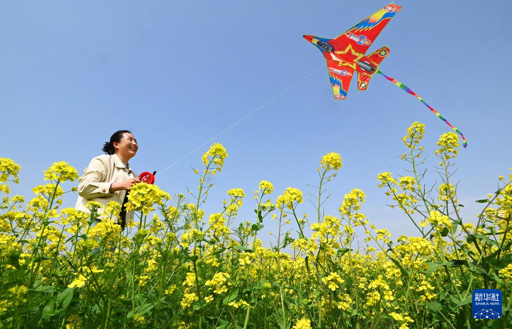 4月3日,游客在河北省邯郸市峰峰矿区大社镇南岗村油菜花田里放风筝。新华社发(郝群英摄)