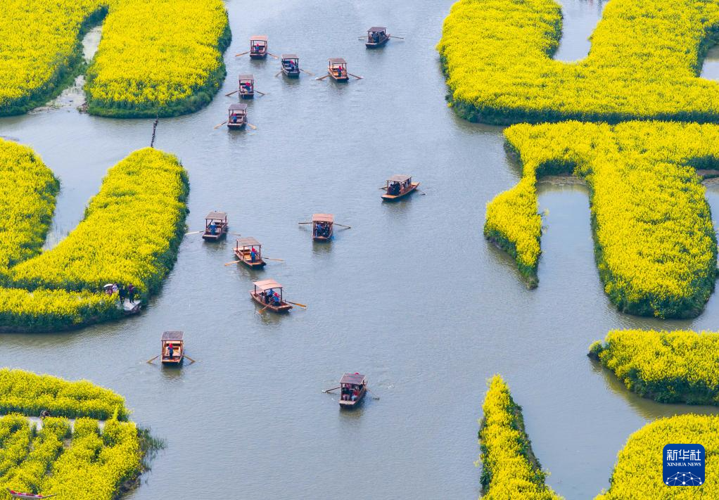4月2日,游客在江苏兴化千垛景区赏花游玩(无人机照片)。新华社发(杨素平摄)