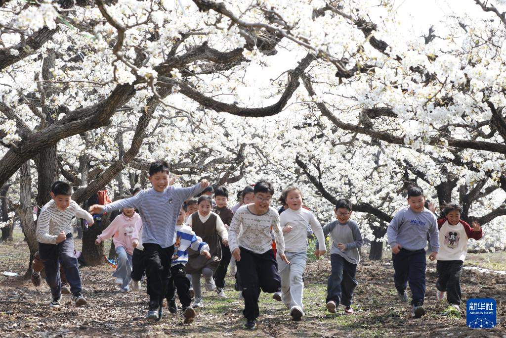 4月2日,在江苏省连云港市灌云县伊园景区,孩子们在梨树花海里游玩。新华社发(吴正祥摄)