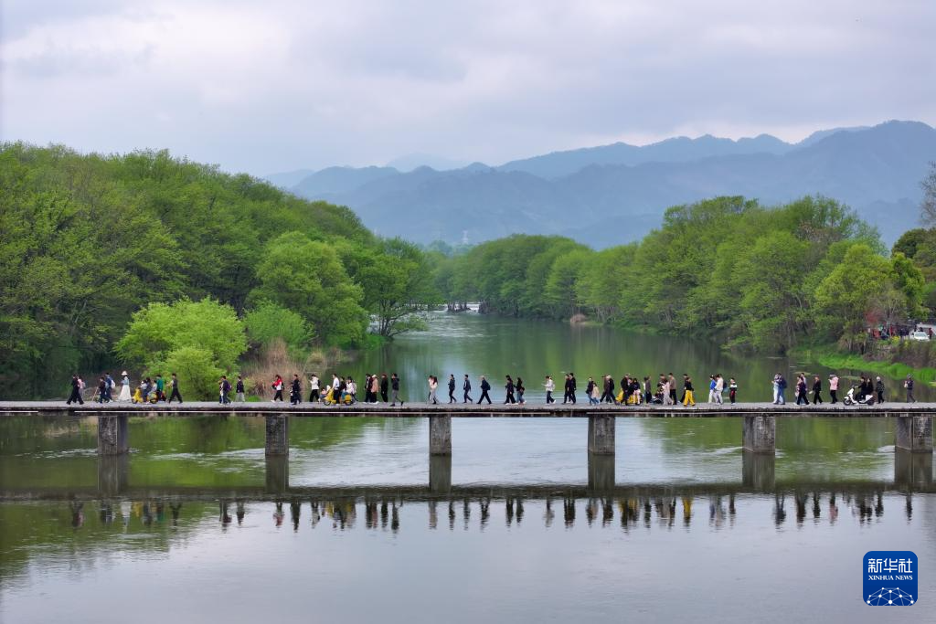 4月4日,游客在安徽省黄山市徽州区西溪南湿地踏青游玩(无人机照片)。新华社发(樊成柱摄)