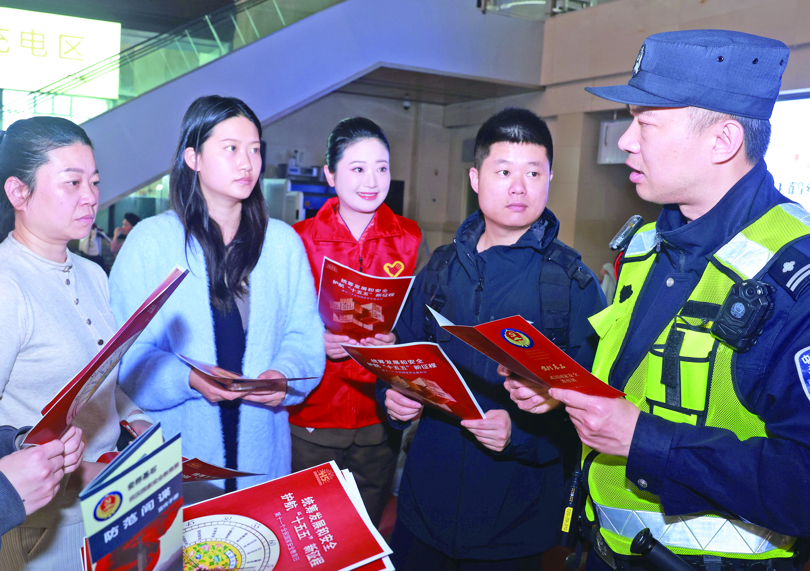 4月13日,武汉铁路公安处民警、志愿者在湖北省汉口站向旅客宣讲防范化解危害国家安全行为的知识。