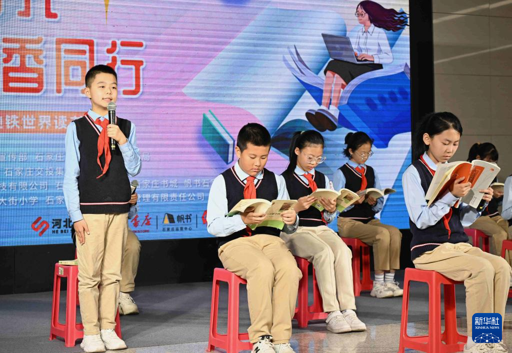 4月19日,小朋友在河北省石家庄市图书馆全民阅读主题活动现场诵读红色故事。新华社发(陈其保摄)