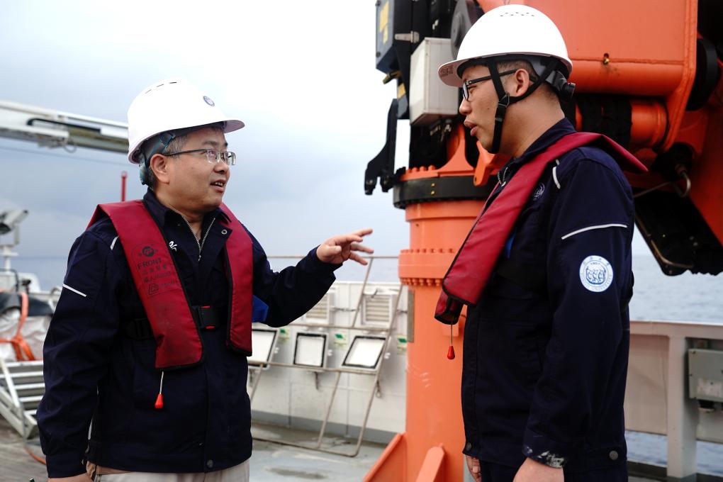 4月23日,“同济”号南海春季航次首席科学家田军教授(左)和首席科学家助理黄恩清教授(右)在船上讨论工作。新华社记者 张建松 摄