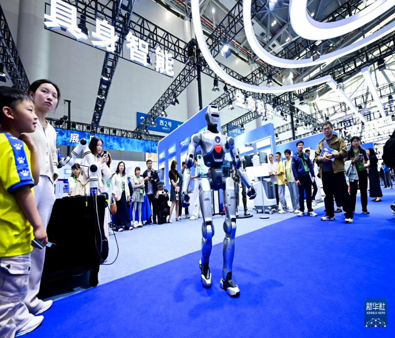 4月26日,观众在第四届中国(安徽)科技创新成果转化交易会上观看一款人形机器人。新华社记者 周牧 摄