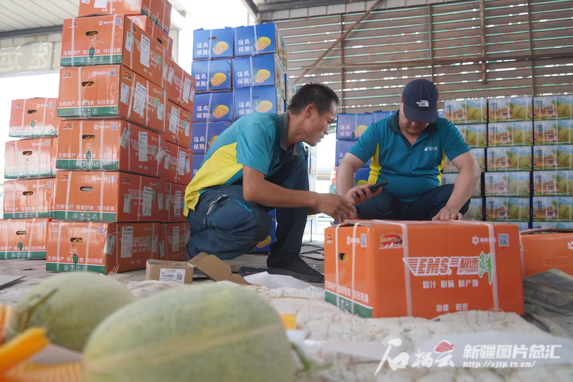 7月7日,在哈密市伊州区南湖乡,成熟的哈密瓜被装箱等待发运。田玉摄
