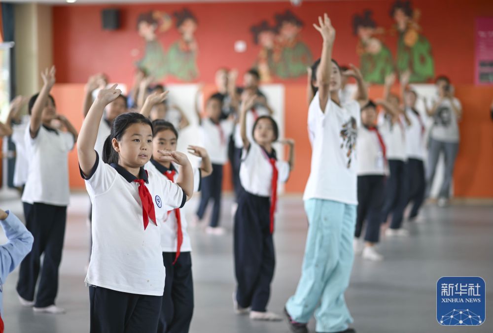 ↑9月4日,新疆生产建设兵团第二师铁门关市华山二中的学生在老师带领下学习舞蹈动作。
