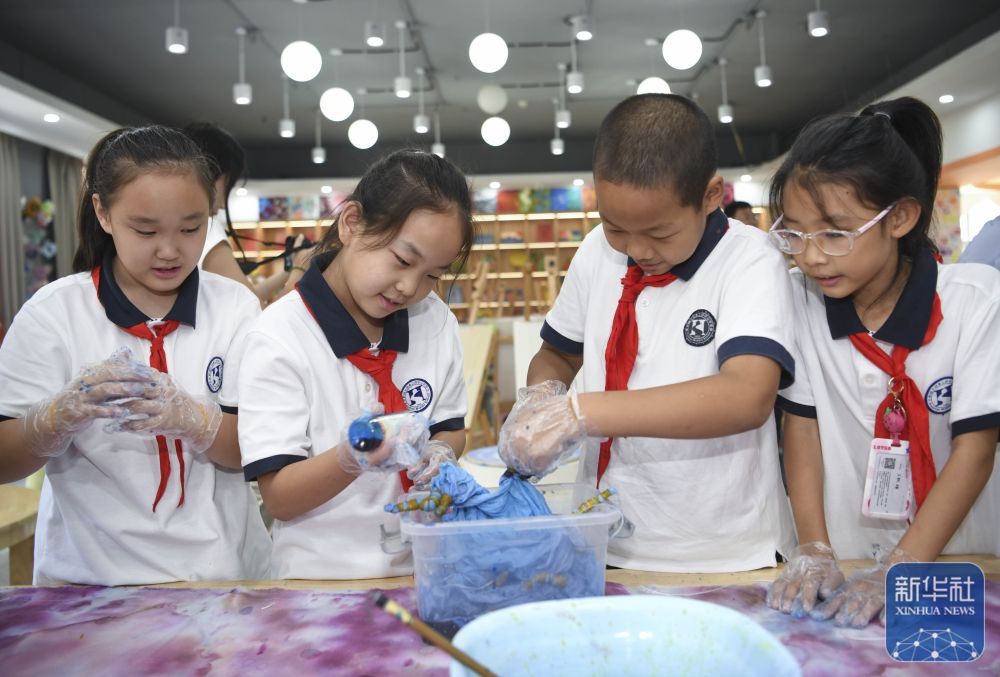 ↑9月4日,新疆生产建设兵团第二师铁门关市华山二中的学生在体验扎染技艺。