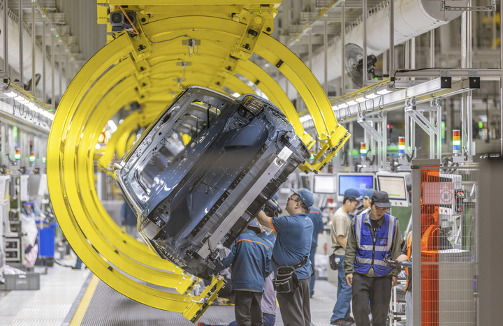 2024年4月25日,在位于重庆市两江新区的赛力斯汽车超级工厂,工作人员在总装车间生产线上作业。新华社记者 黄伟 摄