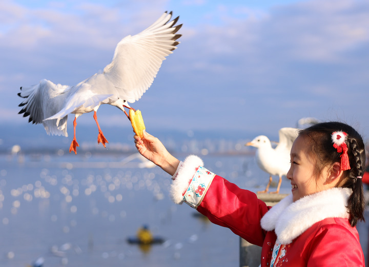 2024年1月17日,在云南省昆明市,游客在滇池边喂红嘴鸥。新华社发(刘元嵩 摄)