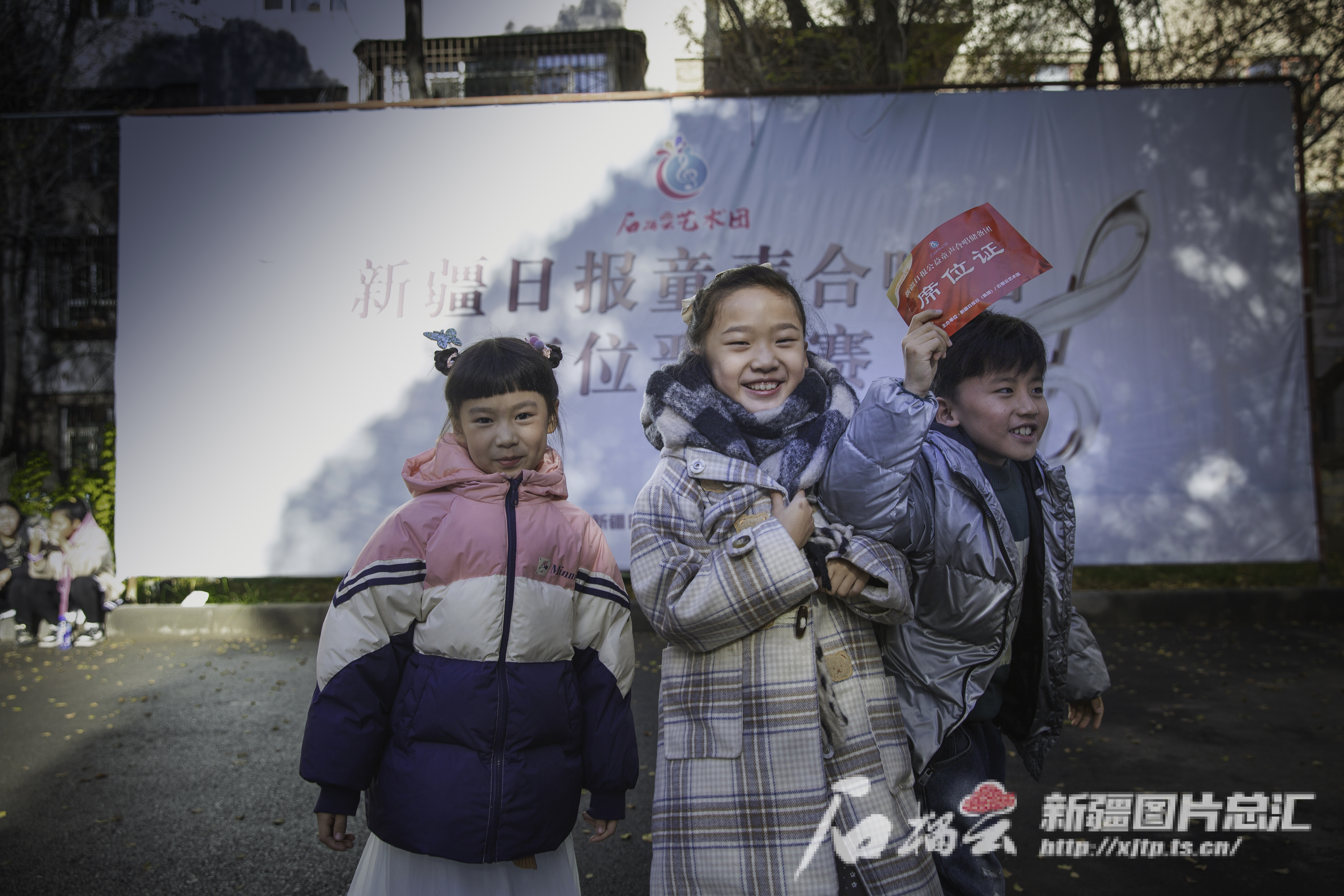11月10日,新疆报业集团石榴云艺术团,领取到席位证的小选手们进行合影。石榴云/新疆日报记者 豆兴军 摄