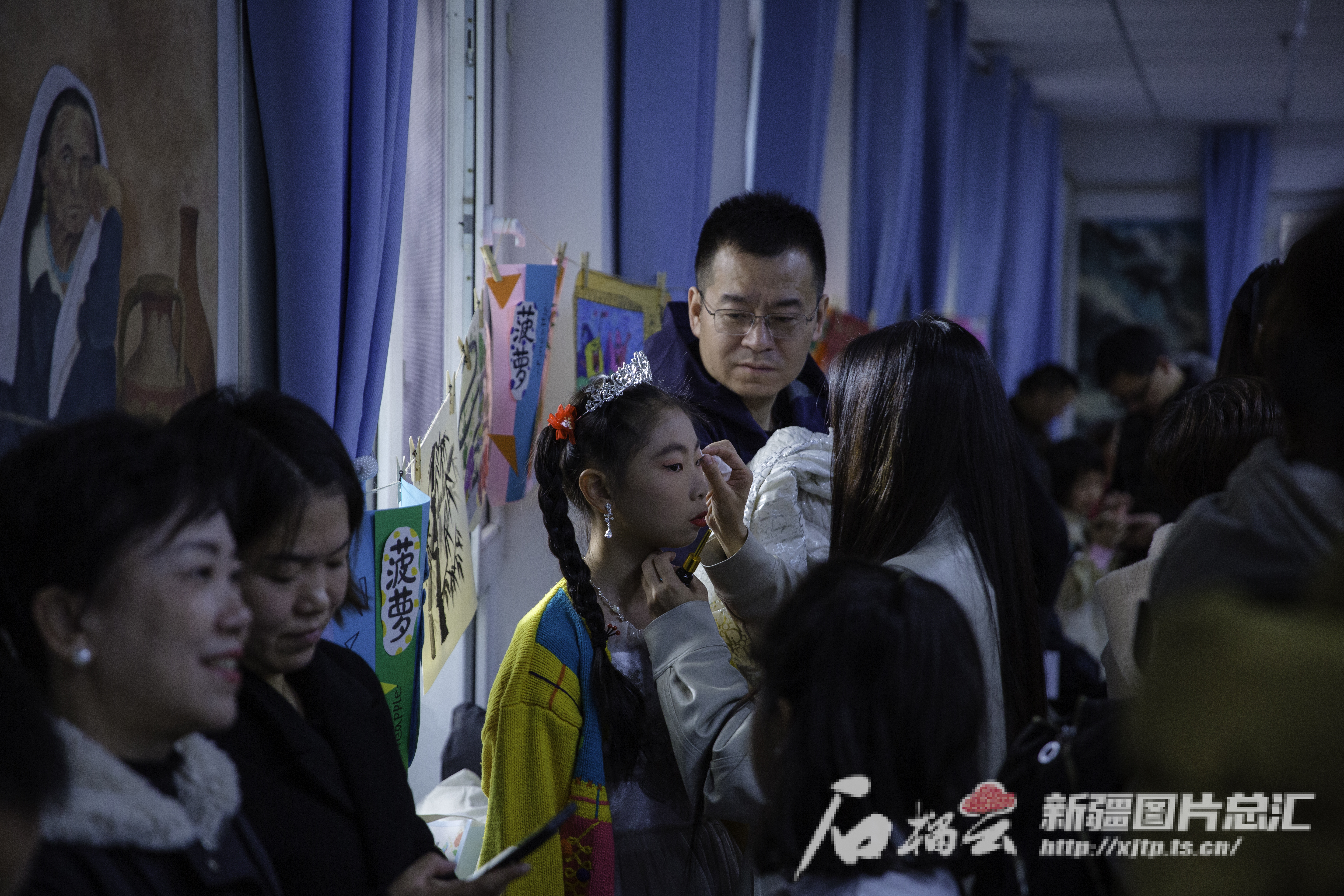 11月10日,新疆报业集团石榴云艺术团,场外家长为小选手进行化妆。石榴云/新疆日报记者 豆兴军 摄