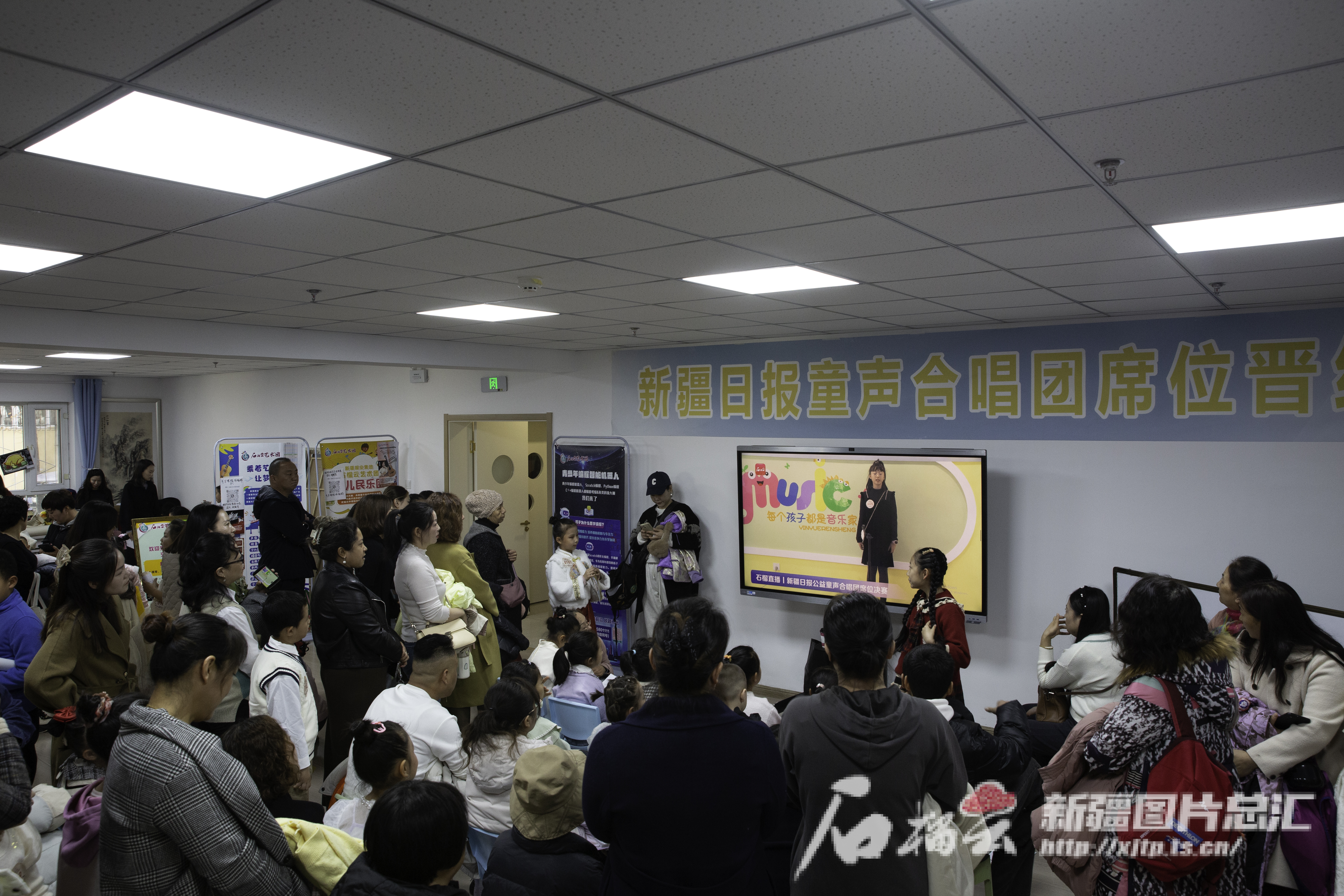 11月10日,新疆报业集团石榴云艺术团,等候区家长和小选手现场观看直播。石榴云/新疆日报记者 豆兴军 摄