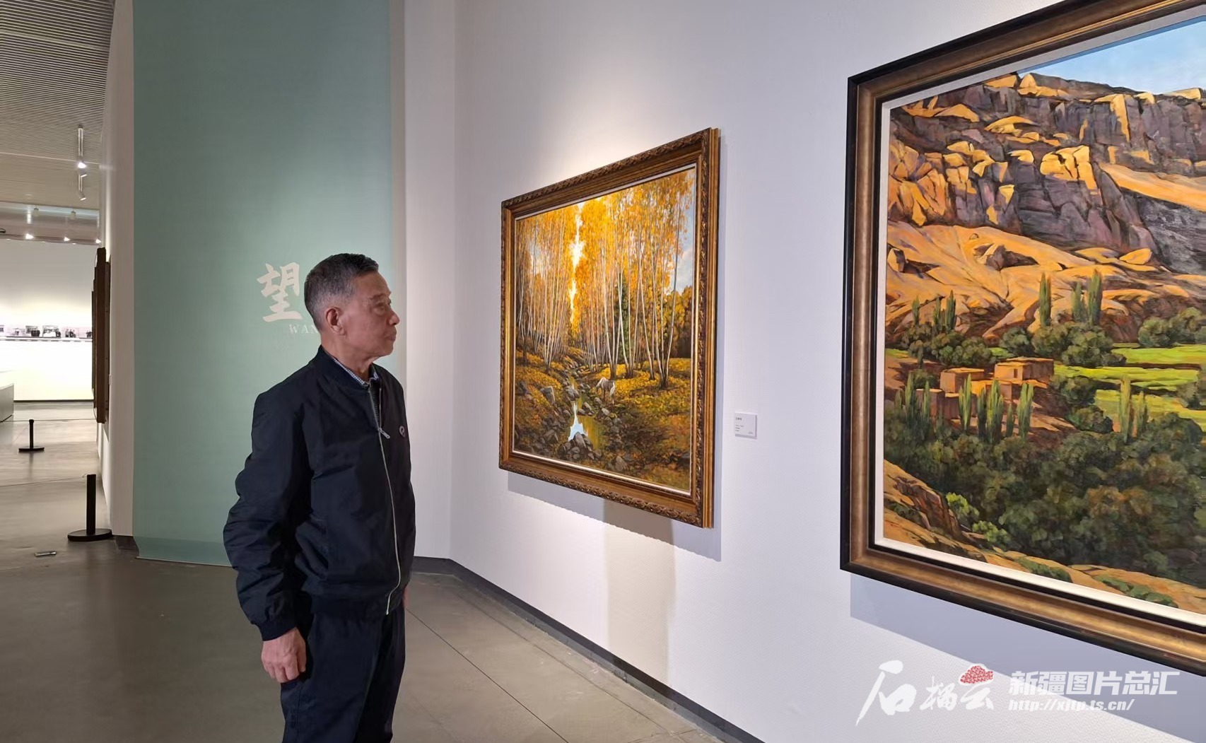 黄建新在“色彩的回响——黄建新油画作品展”展厅重新审视自己的作品。天山网-新疆日报记者 玛依古丽·艾依提哈孜摄