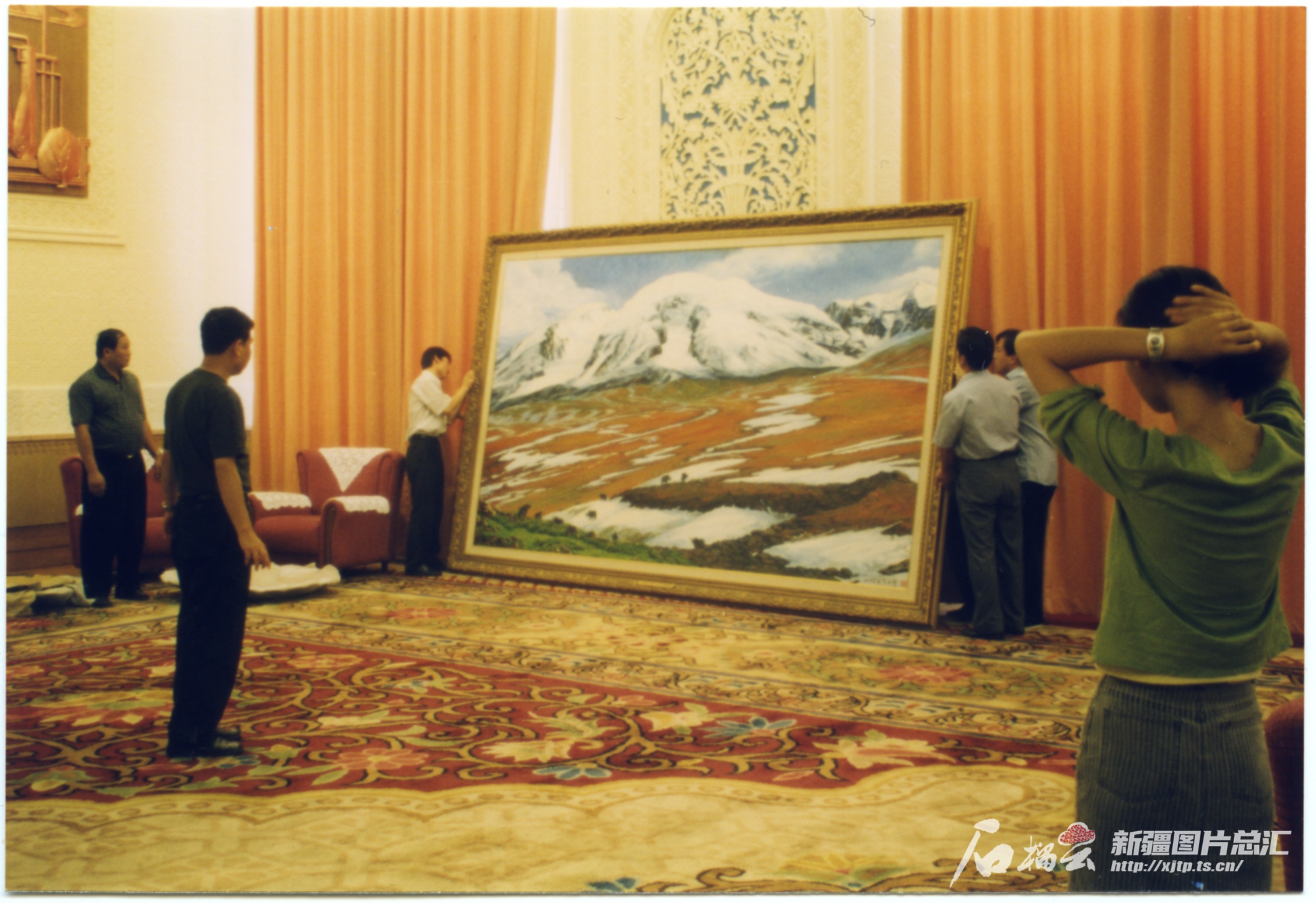 2002年,当人民大会堂新疆厅重新改造之际,厅内的美术创作重任落在了新疆画院的肩上,图片为正在悬挂新的油画作品。(图片由受访者提供)