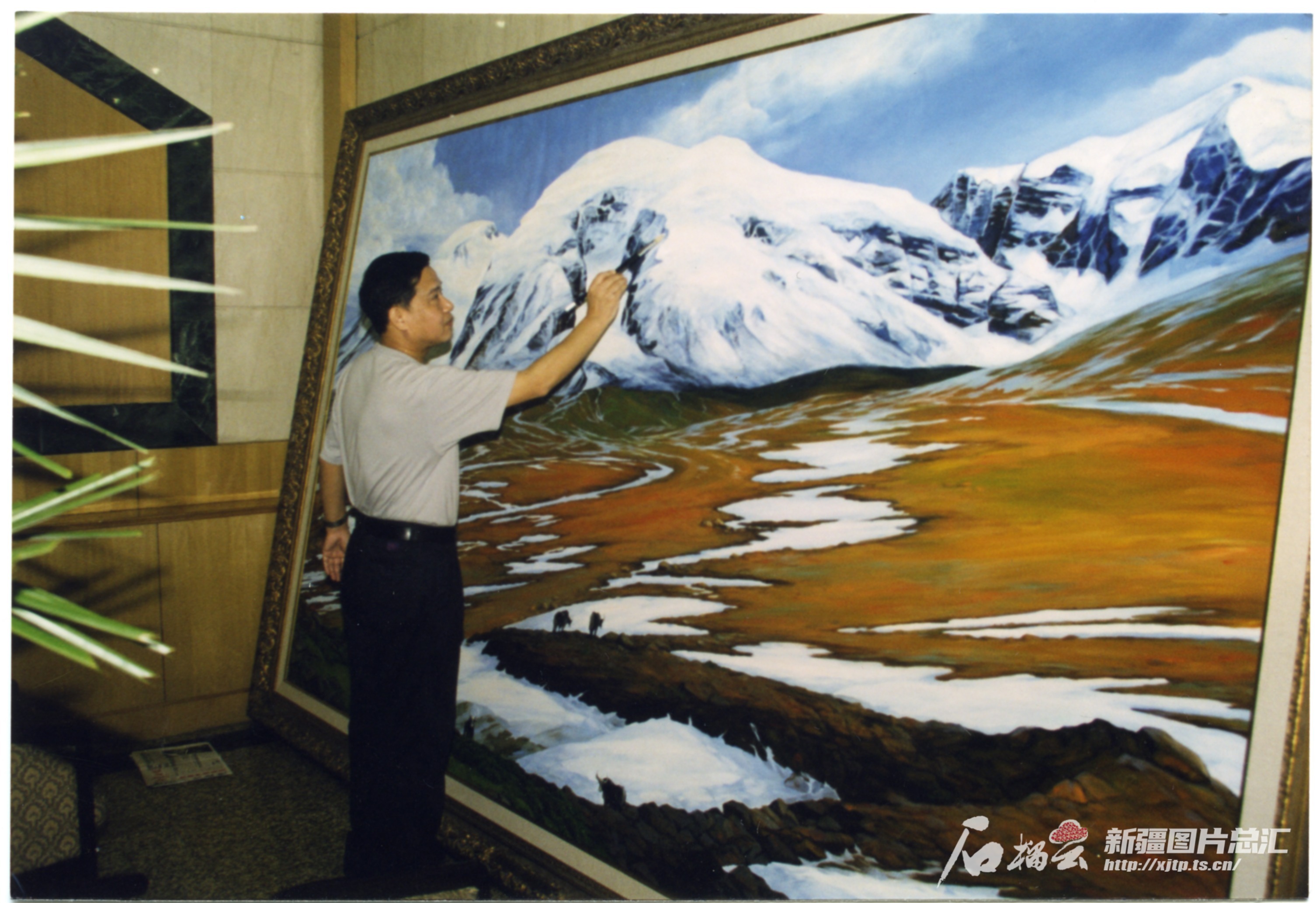 黄建新,这位在新疆沃土上成长起来的画家,曾在人民大会堂新疆厅留下了自己的艺术印记。2002年,当人民大会堂新疆厅重新改造之际,厅内的美术创作重任落在了新疆画院的肩上,黄建新和同事们一起接受了任务。他回忆那段紧张而又充实的创作时光,感慨万分:“时间紧,但我们的艺术创作热情高。团队从接到任务到完成草图,仅用了短短3个月。”正是这份对艺术的执着与追求,让他与团队共同打造了《高原之歌》《塔里木河胡杨林》(作者白钢)以及《天山之春》3幅震撼人心的作品,以独特的视角和精湛的技艺,展现了新疆南北疆的壮丽景色与社会发展进步。